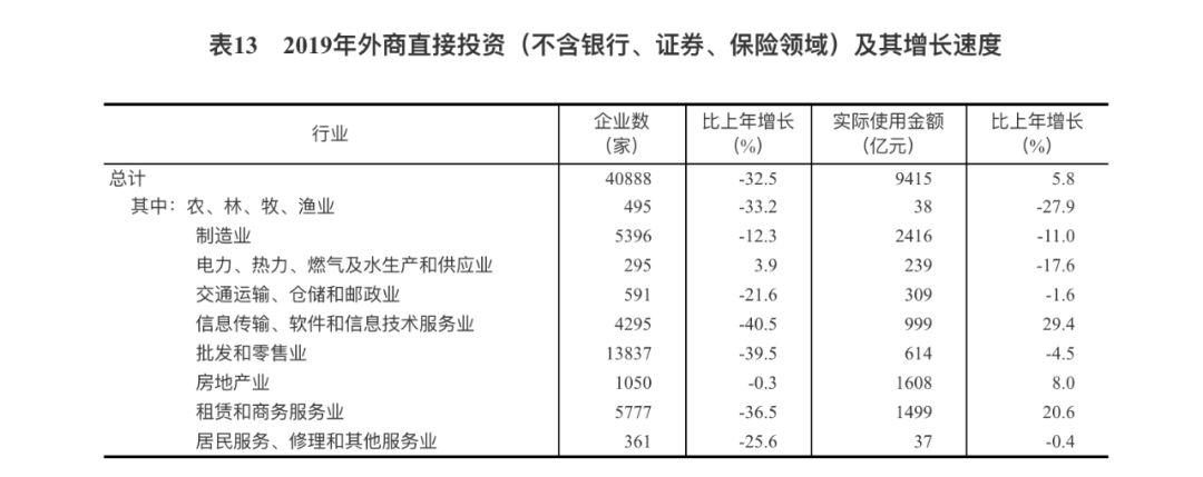 全年外商直接投资(不含银行、证券、保险领域)新设立企业40888家,比上年下降32.5%。实际使用外商直接投资金额9415亿元,增长5.8%,折1381亿美元,增长2.4%。其中“一带一路”沿线国家对华直接投资新设立企业5591家,增长24.8%;对华直接投资金额(含通过部分自由港对华投资)576亿元,增长36.0%,折84亿美元,增长30.6%。全年高技术产业实际使用外资2660亿元,增长25.6%,折391亿美元,增长21.7%。