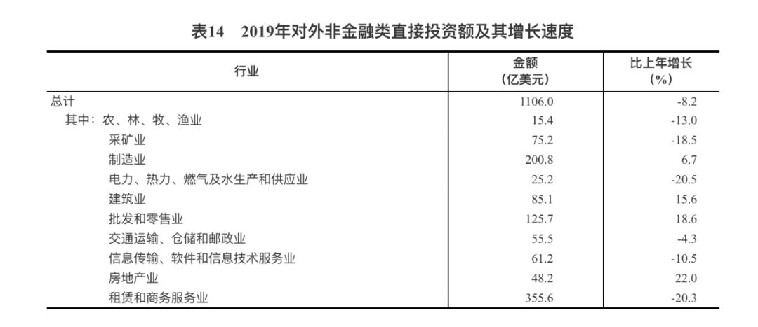 全年对外非金融类直接投资额7630亿元,比上年下降4.3%,折1106亿美元,下降8.2%。其中,对“一带一路”沿线国家非金融类直接投资额150亿美元,下降3.8%。