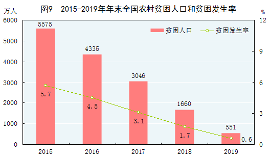 脱贫攻坚成效明显。按照每人每年2300元(2010年不变价)的农村贫困标准计算,年末农村贫困人口551万人,比上年末减少1109万人[26];贫困发生率[27]0.6%,比上年下降1.1个百分点。全年贫困地区[28]农村居民人均可支配收入11567元,比上年增长11.5%,扣除价格因素,实际增长8.0%。