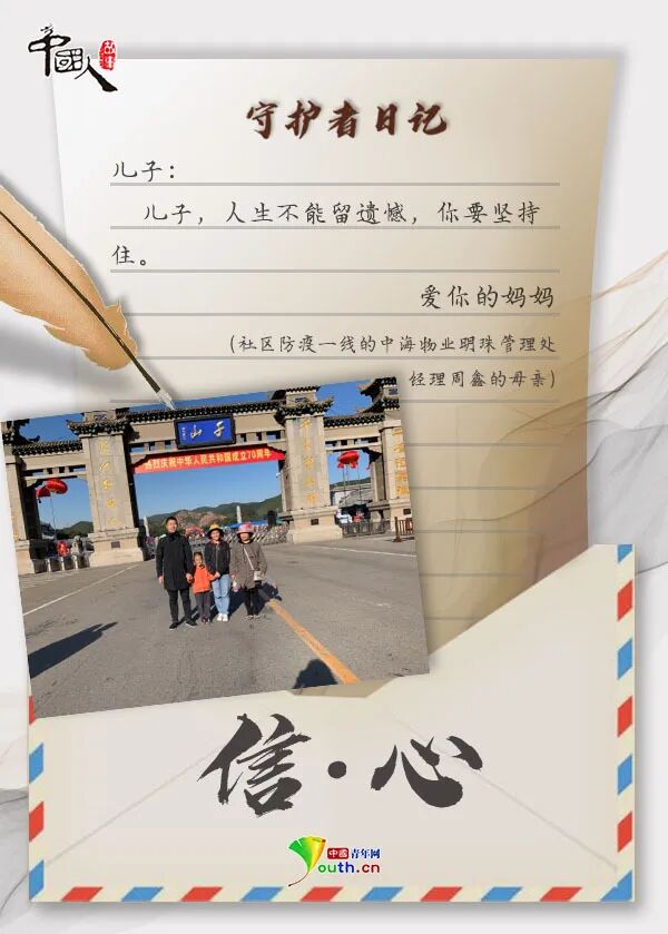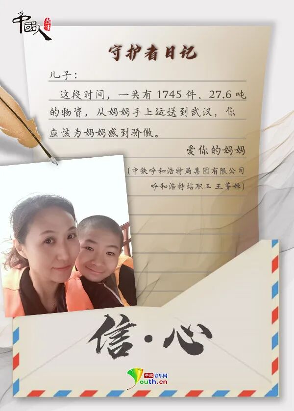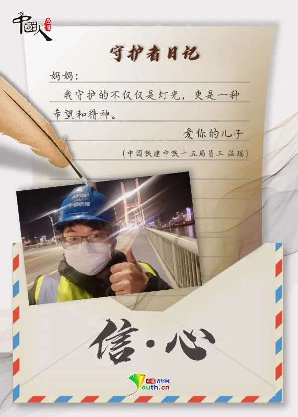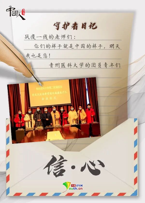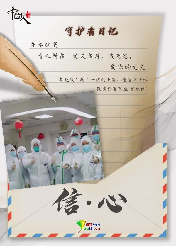 战“疫”, 把整个中国紧紧连在了一起。 无数身影离开温暖的家门, 义无反顾地奔赴武汉。 跨越千山万水, 一封家书,一纸情深。 那是难舍的牵挂, 是殷殷的嘱托, 是“健康所系,性命相托”的 庄严承诺。 家书纸短,家国情长。 写信人:云南森林消防总队 新训大队消防员樊兴仁 收信人:老婆 亲爱的老婆: 你我已经携手走过了五个春秋,请原谅我在你身处战“疫”一线最艰难的时候不能陪在你身边。大年初一,你们所在的德宏州红十字会医院被确定为新冠肺炎收治定点医院,而我们的宝宝,还有两个月就要出生了。 面对疫情,你递上了请战书。我试图劝你退出的时候,你说:“医院现在人手紧张,我不能退出。”视频里,看到你工作的场景,你戴着多层口罩,穿着两层笨重的防护服,若干小时不停地忙碌。我心疼你,但也支持你。 老婆,我在新训大队一切都好。疫情发生后,我们也成立了疫情防控党员突击队,我第一时间写了申请,我想和你并肩战“疫”。请你答应我,在战斗时一定要保护好自己和我们的宝宝,我永远在你身后,不用害怕! 爱你的老公 写信人:女儿赵小毅 收信人:四川大学华西医院 风湿免疫科副主任赵毅 爸爸: 您在武汉还好吗?那天您接了一个电话,说自己要去武汉了。夜里,我做了一个梦,梦见您戴着白口罩在抢救病人,却不和我说话,我着急得哭了出来。爸爸,我想您了! 妈妈说您没时间给我们打电话,您也穿着纸尿裤吗?病人有没有乖乖听话?电视说武汉刮风下雪了,刮风下雪是不是可以杀死病毒?您是不是就可以快点回家? 爸爸,我长大了,可以照顾妈妈和奶奶。您一定要小心再小心啊!我很骄傲,我很自豪,我有一个英勇的爸爸。 爱你的女儿 写信人:贵州医科大学的 团员青年们 收信人:战“疫”一线的老师们 敬爱的师长: 或许,我们并不都知道你们的名字,但是你们的样子,我们铭记在心!作为学生,我们学习您教授的知识,也深受您精神的影响。您背包离开,义无反顾的样子,告诉了我们作为一名医务人员,需要怎么做、应该承担起什么样的责任。 从前的我们或许只是年少不懂事的孩子,但是相信未来,我们也一定会好好接下您的班,在面对灾难的时候,也能够坚决地签下请战书,前往治病救人的最前线。你们的样子就是中国的样子,明天我也是您! 贵州医科大学的团员青年们 写信人:周鑫的母亲 收信人:社区防疫一线的中海物业 明珠管理处经理周鑫 儿子: 从大年三十到现在都没能看到你,爸妈都好想你。在这次抗击疫情的战役中,你做了自己力所能及的事,爸妈为你感到骄傲。 妈妈知道,你在一线很辛苦,不仅要保证居民正常生活,还要确保防疫工作顺利进行。你每天都要进行安全排查,帮助业主解决困难。我们知道,你已经尽了自己最大的努力。 妈妈现在不在你身边,但是却想告诉你,一定要沉下心来,和大家好好沟通,尽量帮助人家解决问题。人命关天,不能留下遗憾。 爱你的妈妈 写信人:中国铁建中铁十五局 员工温瑞 收信人:妈妈 老妈: 请原谅儿子,这个春节没能回家陪您一起过。疫情暴发,作为一名建设者,我觉得我不能在这个时候离开。 这些天的晚上,武汉长江二桥上的灯都会如约亮起。每每看到这灯光,我的心里都会别样感动。我知道,我守护的不仅仅是灯光,更是一种希望和精神。桥上有时会有无人机飞过,是媒体在直播,我把链接发给您,您看看,这是您儿子守护的灯光。 妈妈,我一个人会好好照顾自己,我想再坚持坚持,我不怕孤独。您一定要照顾好自己,等春天来了,我就回家看您。 爱你的儿子 写信人:东南大学附属中大医院 江北院区重症医学科护士闻静 收信人:男友吴罡 亲爱的: 大年三十那天晚上,医院说需要医护人员支援武汉,你的第一反应就是“我可以去”。说实话,我很担心。那天我想了很久,同为医护人员,我们可以尽一份自己的力量,这是光荣的。当你挺身而出,奋战在一线,就像是个会发光的“天使”。 最近,医院组织第二批报名了,这次我也报名参加了。我想,你一定也会支持我的。等疫情过去了,你是我最想见的人。 爱你的宝贝 写信人:意大利华人作家 胡兰波 收信人:儿子 亲爱的儿子: 大抵是因为我不够坚强,最近总是想,如果我此时能在北京陪伴你们该有多好。带着你们往返中国,妈妈是想让你们也爱妈妈的祖国,说咱们的母语。 我们各自肩负着责任,对他人和国家的责任。在这次战“疫”中,我相信你们能够看到人间的大爱,你们一定能够明白妈妈的祖国,在经历这么多苦难后,是有多么的坚强。我们有不一样的战场,我们都是好战士! 爱你的妈妈 写信人:奔赴战“疫”一线的上海 儿童医学中心隔离诊区医生陈轶维 收信人:妻子 吾妻漪雯: 两周前,寥寥数语,就告别你和幼子,进入战疫隔离一线,也实属无奈。病毒肆虐,荼毒神州,作为医生,去,责之所在,道义在肩,我无怨。 我在一线一切都好。告诉儿子,等爸爸和叔叔阿姨们帮助了好多好多小朋友,等他们都好了,一定去迪士尼,爸爸从来不食言。 青海长云暗雪山,孤城遥望玉门关,黄沙百战穿金甲,不破楼兰终不还。 爱你的老公 写信人:中铁呼和浩特局集团 有限公司呼和浩特站职工王菁婵 收信人:儿子 乖儿子: 从正月大年初二开始,我把你的衣食起居交给了爸爸,请原谅妈妈不能陪伴你。 在你还没出生的时候,妈妈就经历过这样一场“战疫”。当时,是一个个无所畏惧的叔叔阿姨为妈妈“遮风挡雨”,
