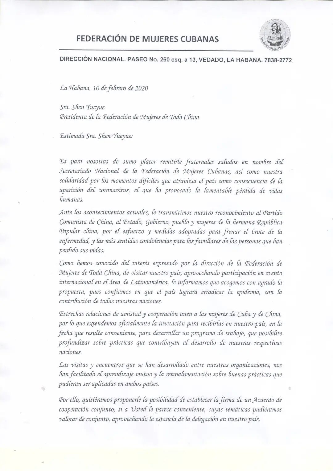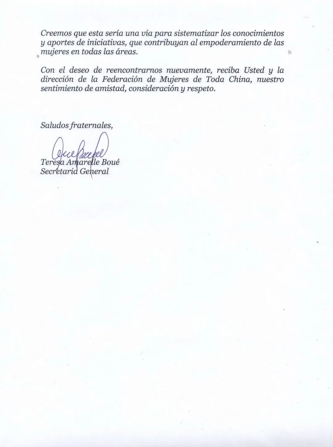 “为使古巴和中国妇女友好合作关系更加亲密、团结更加紧密,在此我们正式邀请贵会代表团在方便的日期来访。我们组织间进行的访问和会晤,有益于我们相互学习,并可促进我们借鉴良好实践经验用于本国工作。”