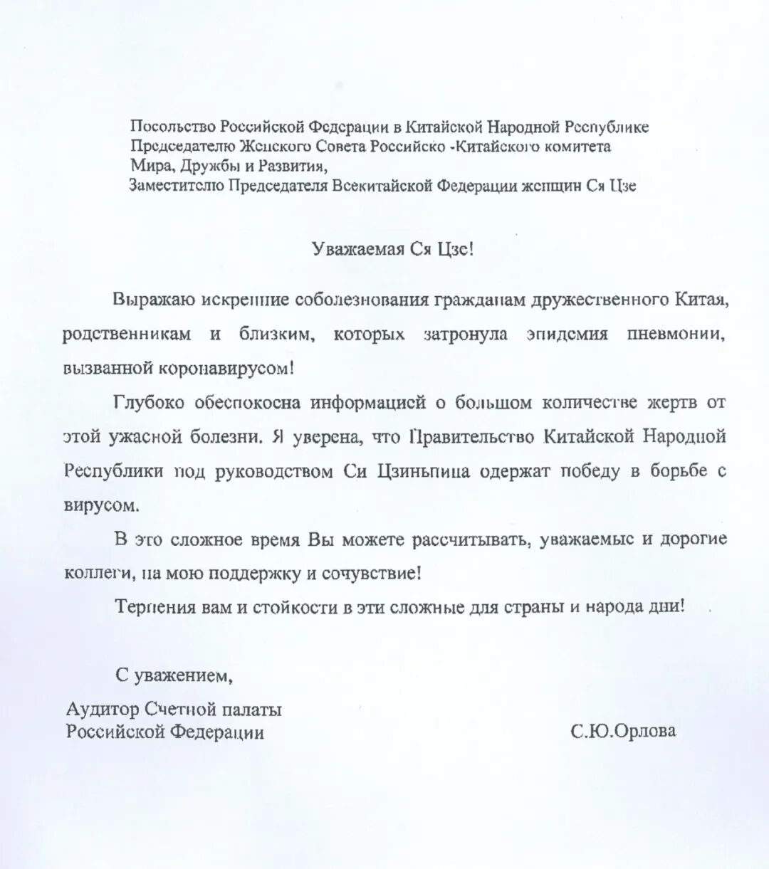 中俄友好、和平与发展委员会妇女理事会俄方主席,俄罗斯审计署审计委员奥尔洛娃致函全国妇联,对新冠肺炎患者及其亲属致以诚挚的慰问。