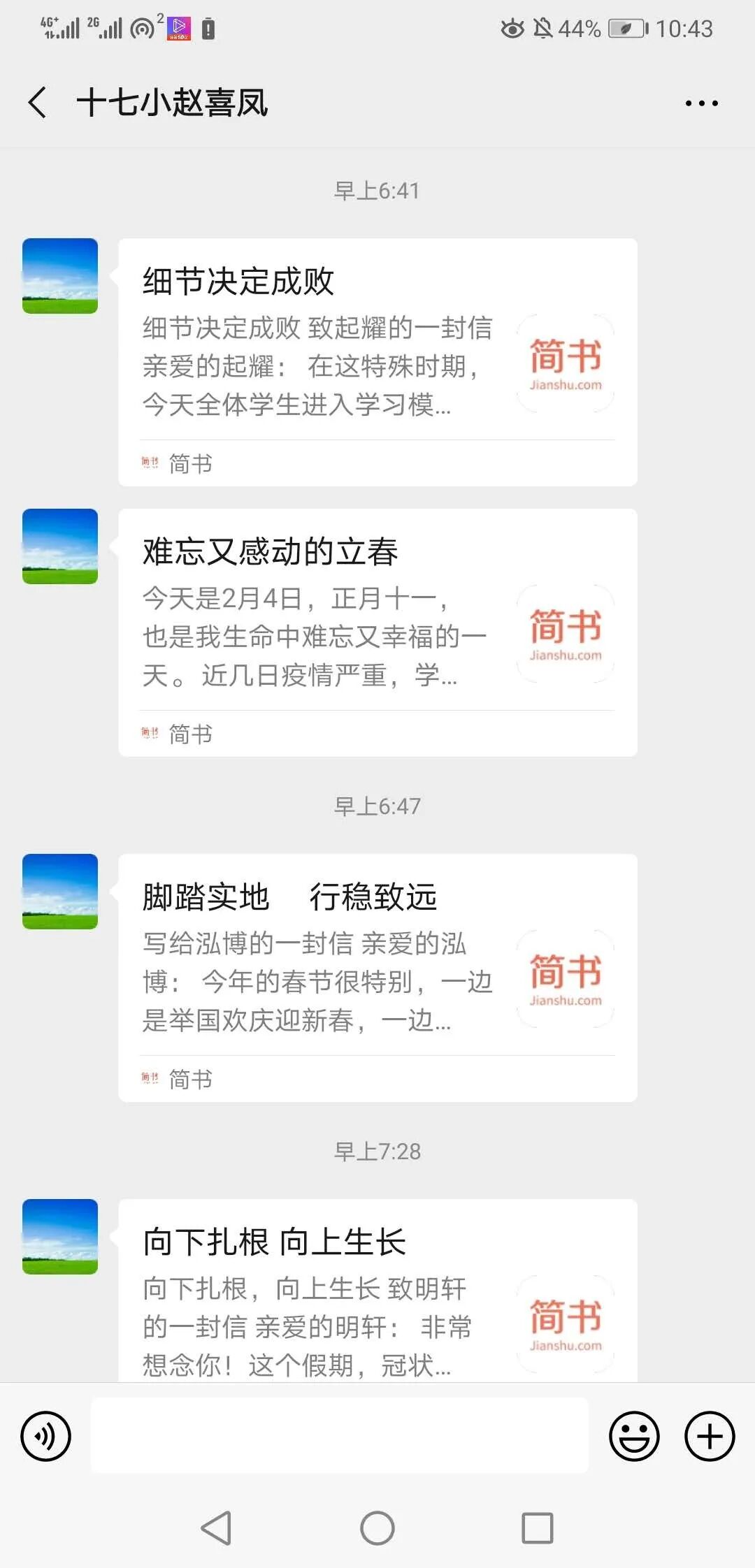 2月5日,一位家长用一首古体诗“新春得老师书信感怀一一一致赵喜风老师”表达对赵喜风老师的感激之情: