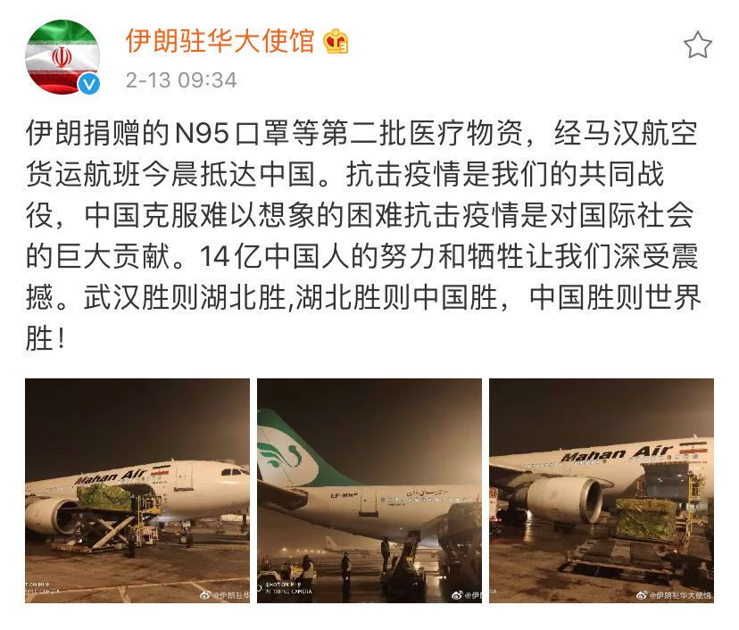 早在2月13日,中国坚持抗疫初期,伊朗捐赠的N95口罩等第二批医疗物资抵达中国。@伊朗驻华大使馆喊出:“武汉胜则湖北胜,湖北胜则中国胜,中国胜则世界胜!”
