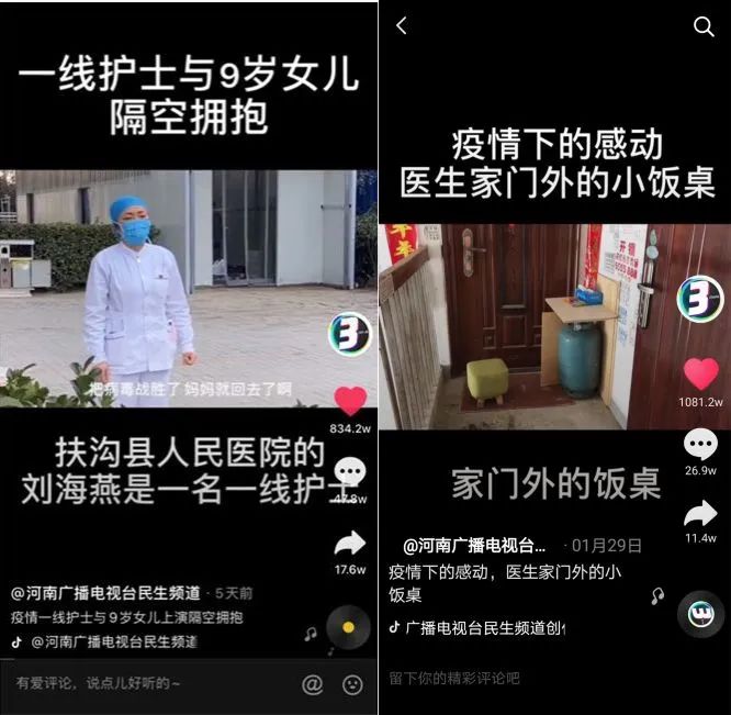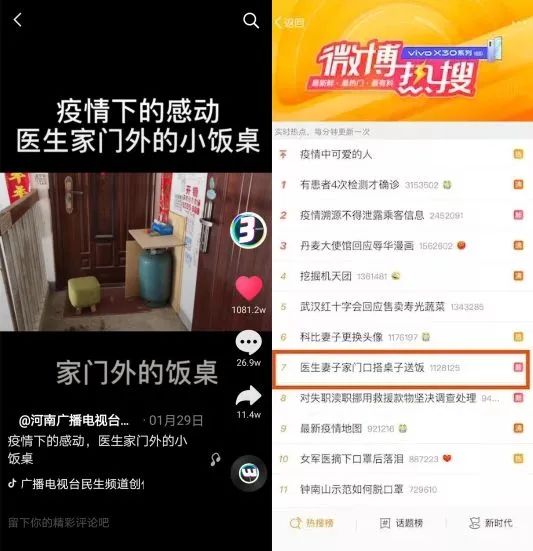 “医生家门外的小饭桌”,抖音平台播放量达到1.9亿次,点赞量达到1081.2万次,冲上微博热搜榜第七位,微博全网阅读量达9145.5万。