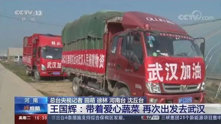 采访中,河南广电新闻中心的记者了解到,王国辉曾在武汉服役17年,三年前返回河南老家沈丘县白集镇田营行政村带领村民发展大棚蔬菜种植。得知武汉疫情告急,大年三十,王国辉10小时驱车500公里,把5吨蔬菜送到武汉火神山医院。
