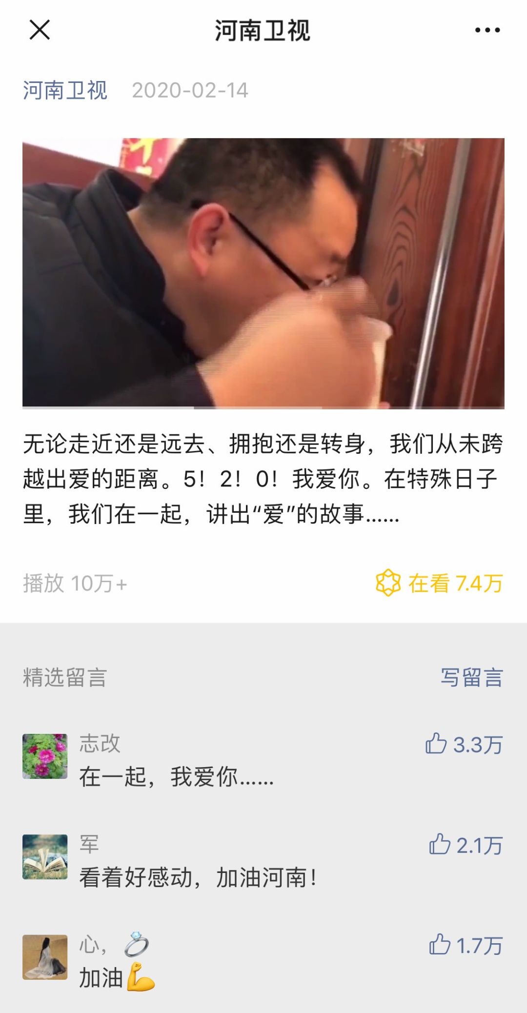 这条由河南省委宣传部、河南卫视策划制作的《“出彩河南人”楷模发布厅》特别节目“在一起”之原创微视频《5米,2米,0米……》,微信播放量高达900多万次,评论近5万条,点赞近10万次。视频还通过微博、抖音、今日头条、西瓜视频、腾讯企鹅、新浪看点、一点资讯、百度百家等传播,并被多个媒体号主动转发。
