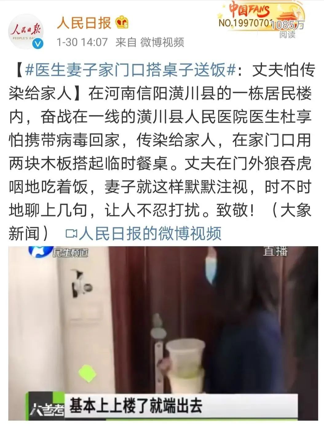 1月29日,河南广播电视台大象新闻记者徐荣荣、崔伟来到潢川县的一个居民楼内,见到了潢川县人民医院医务科杜享医生在家门口吃饭的一个小餐桌。因为每天都要和患者打交道,奔波在发热门诊和留观病房之间,害怕携带病毒传染给家人,杜医生就在自己家的门口,用空的液化气罐和木板搭起了一张临时小餐桌。上楼之前,妻子就把做好的饭菜端出去,然后再倚靠在门口,看着他狼吞虎咽的样子,时不时聊上几句,那一刻,记者静静的退到了一旁,不忍心打扰,想把时间留给他们,默默的记录下这温馨的一幕。