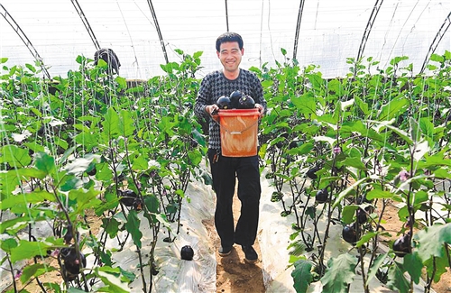 2月23日,饶阳县五公镇南张保村种植户马建峰在采摘茄子。 崔佳栋摄(中经视觉)