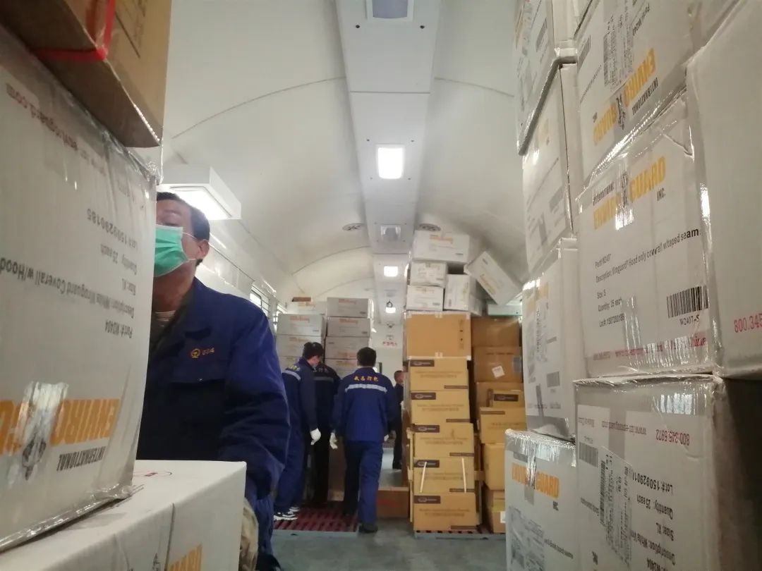 2月21日7时25分,由北京西开往南宁方向的Z285次列车停靠武昌站1站台,行李车上满载工信部调拨的19000套防护服。