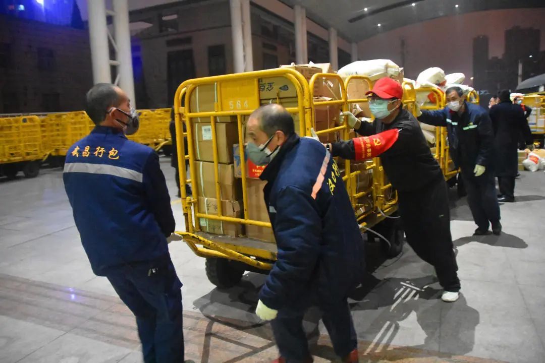 武昌站行李员邹云介绍说,疫情发生以来,行包车间平均每天大约要装卸转运7000余件防疫物资,运送物资的“带货”列车,大多都是凌晨抵达。一个通宵班里,装卸工人平均要搬运400件货物,驾驶员人均往返转运50多趟。