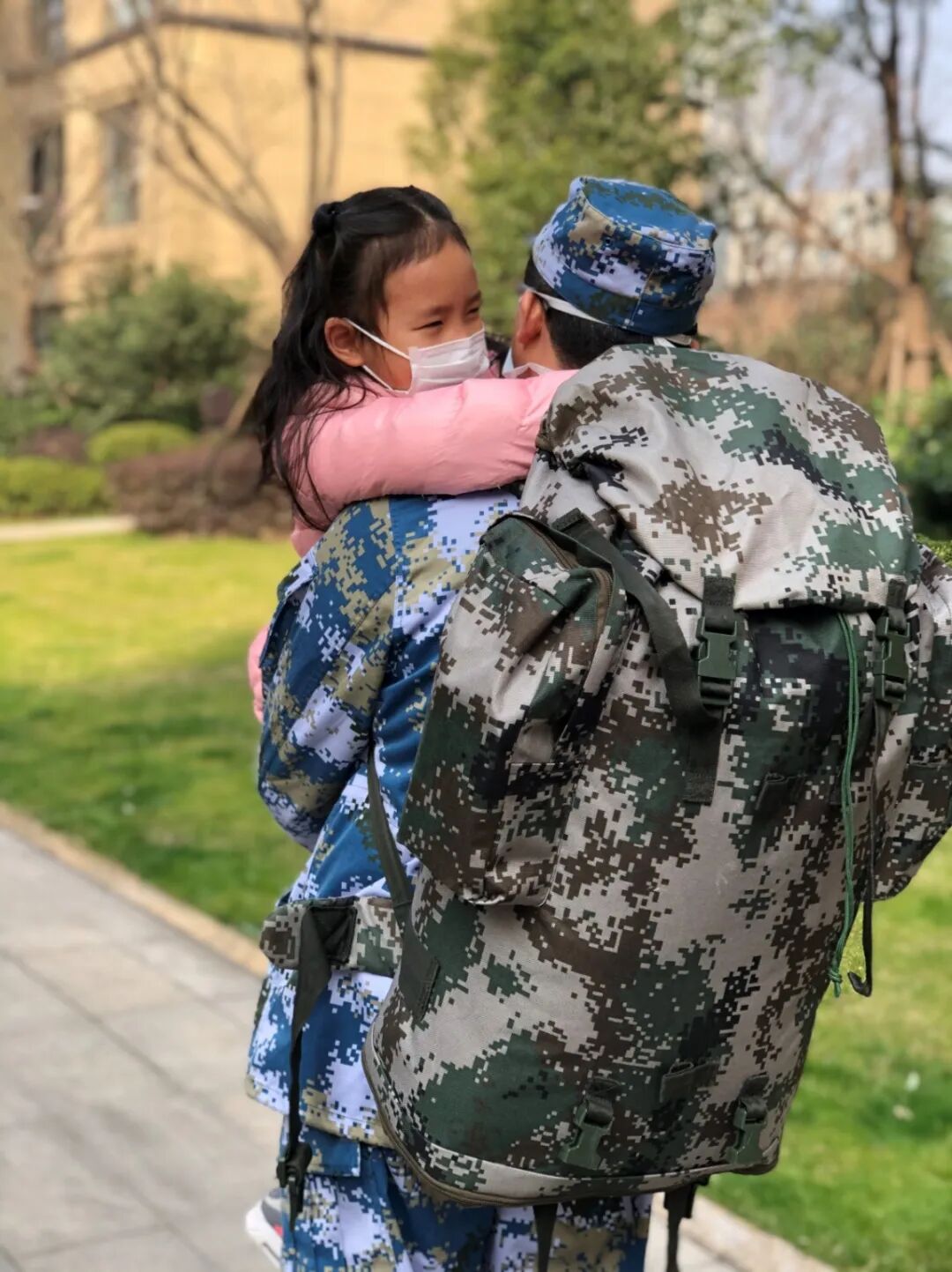 上午你接到命令,要将行囊送到集中点,预计第二天出发。女儿以为爸爸这就要走了,赶紧戴好小口罩,跟着我们一起下楼。小小的她被你抱在怀里,紧紧搂着你的脖子,看着依依不舍的她,我想,长大以后,她一定会为有你这样的英雄爸爸而自豪。