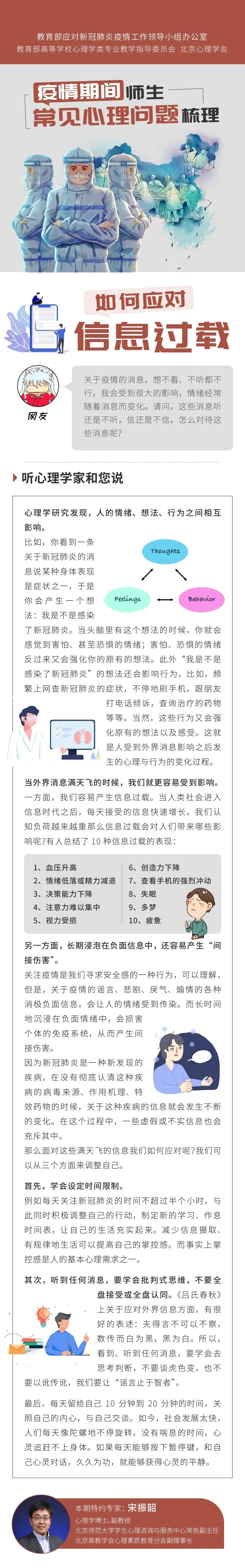 今天,推出《用“心”战“疫”》第 期,随教育小微一起来听北京师范大学学生心理咨询与服务中心常务副主任宋振韶、外交学院心理咨询中心主任宗敏详解,疫情期间师生常见心理问题如何调整↓↓↓