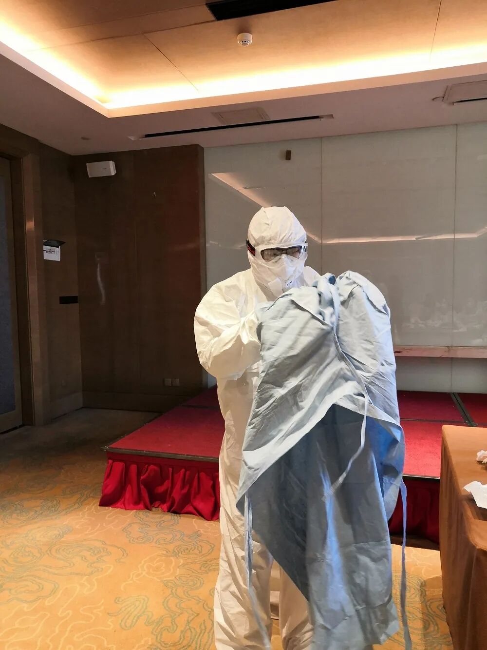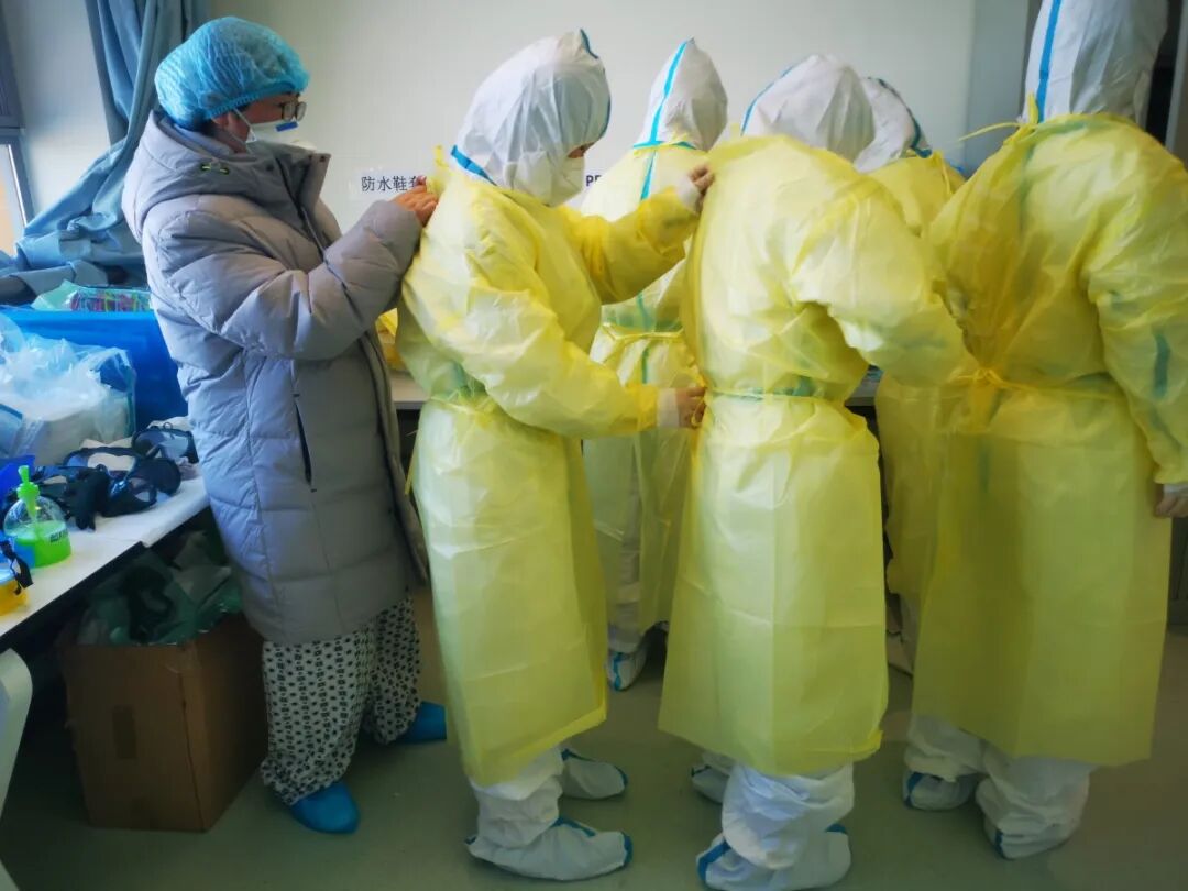 在医疗组、护理组出入病房时,都有感控组的值班人员陪同督导,他们逐项查验队员们穿戴/脱去防护用品的操作,确认合格后再出入。