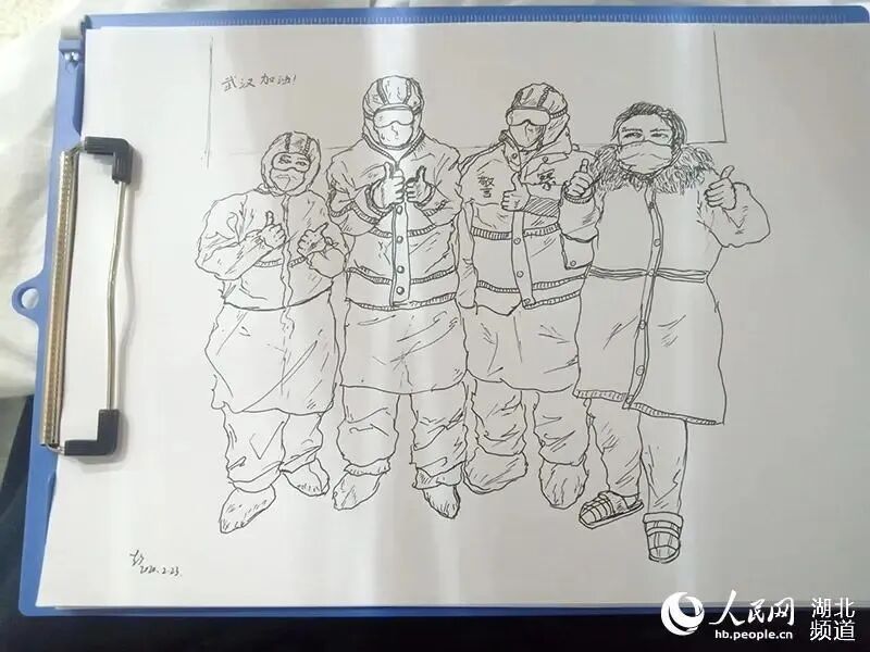 武汉市东湖中学 高三2班的彭昕烨, 是2月6日凌晨第一批进入 武昌方舱医院的患者。 住院期间, 小彭得到了医护人员的悉心照顾, 出于感动和感激, 他向医护人员借了纸和笔, 将方舱医院温暖的瞬间画成素描。 来自贵州遵义的支援湖北 医疗队护士长李兰 收到了彭昕烨送给她的素描画。 画中的李兰正在悉心照顾病患, 穿着防护服的身影, 充满着温暖的力量。