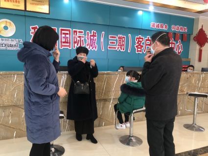 在小区物业办公室,志愿者在与病人一起等候应急出租车期间,指导病人及其家属正确佩戴口罩,使防护更加有效。姚瑜坪/摄