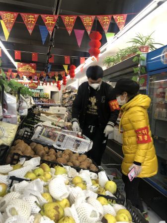 为便利小区居民生活的同时保障居民生命健康安全,小区内有两家超市在疫情期间闭门营业。图为志愿者在超市内按照居民下的订单分拣生活物资。姚瑜坪/摄