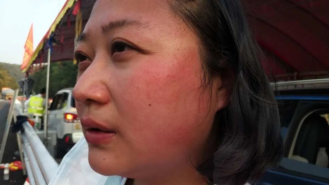江颜君,是一个既爱美又喜欢跳舞的姑娘。在云梧高速防疫一线连续工作了七八个小时,腰累、腿麻、喉咙干、脖子僵硬,毒辣的太阳更是将她原来白皙粉嫩的脸蛋严重晒伤,导致红肿过敏,甚至脱了层皮。脸上一出汗,头发就容易粘到脸上,用手轻轻地撩开,划过脸,都让她觉得刺痛。