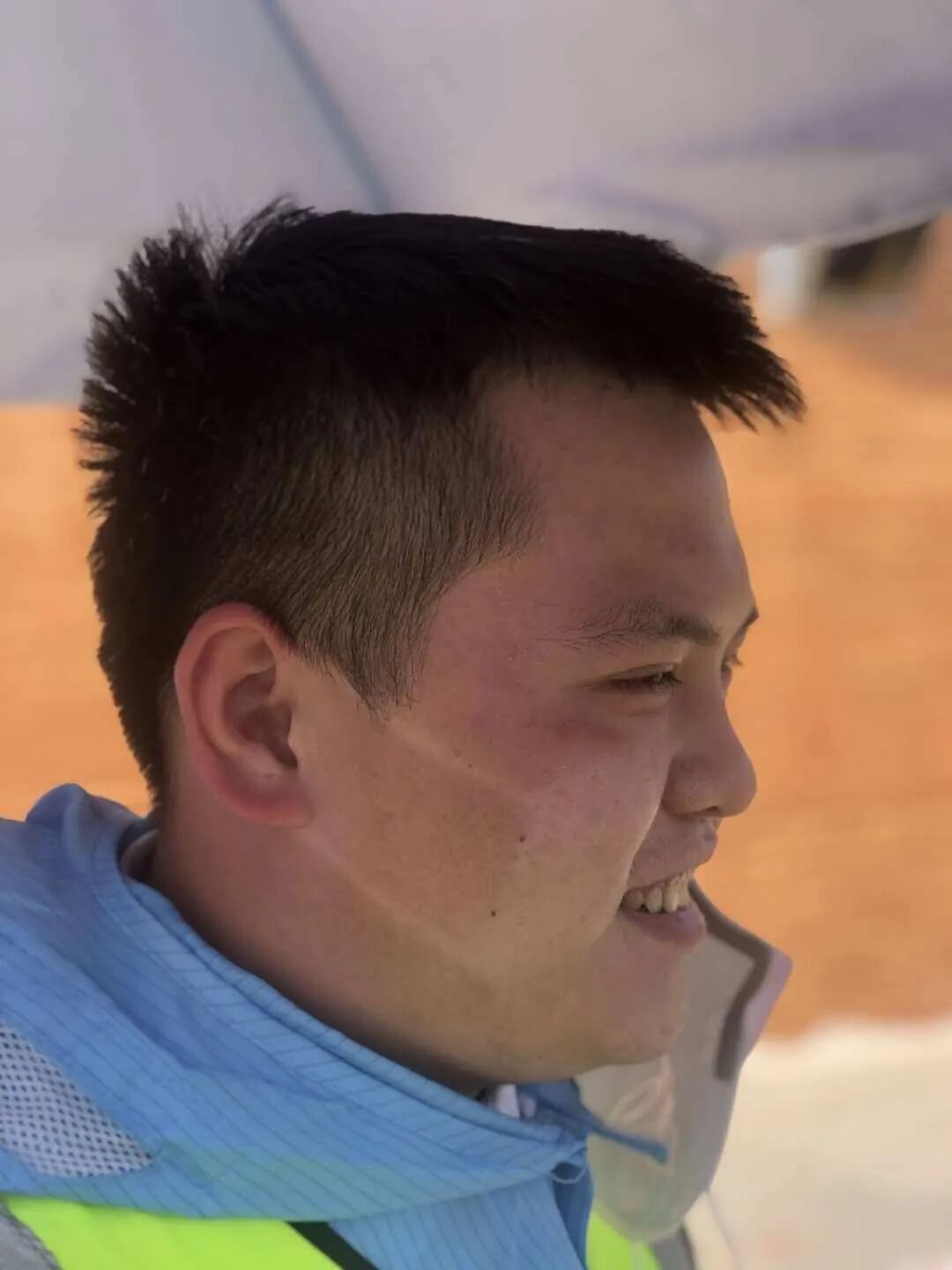 即使是站在遮阳伞底下,戴了遮阳帽,他的脸还是被晒伤了,留下了清晰可见的口罩印,疲惫的他对着镜头依然露出年轻有活力的微笑。