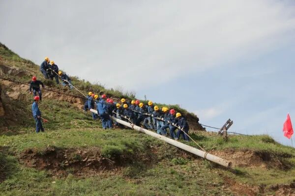 2019年甘肃临洮县供电公司配农网施工人员正在全力以赴移栽电线杆(罗文姬 刘君倩 摄)