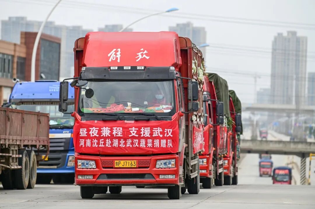 △3月1日,河南沈丘退伍老兵王国辉带队第三次来到武汉送菜,将沈丘县委县政府采购的130吨农副产品捐赠给武汉。新华社发(侯建勋 摄)