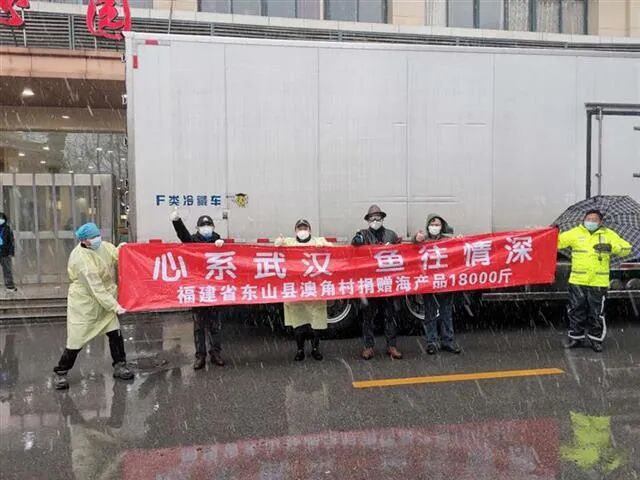 心系武汉,鱼往情深!前不久,福建东山县澳角村渔民捐赠的1.8万斤海鲜产品顶着雪花送到了武汉。这1.8万斤海鲜产品包括紫菜、海鱼、海虾、蟹类、贝类等。这批海产品正是当时武汉的稀缺品,用于改善医护人员的膳食条件。