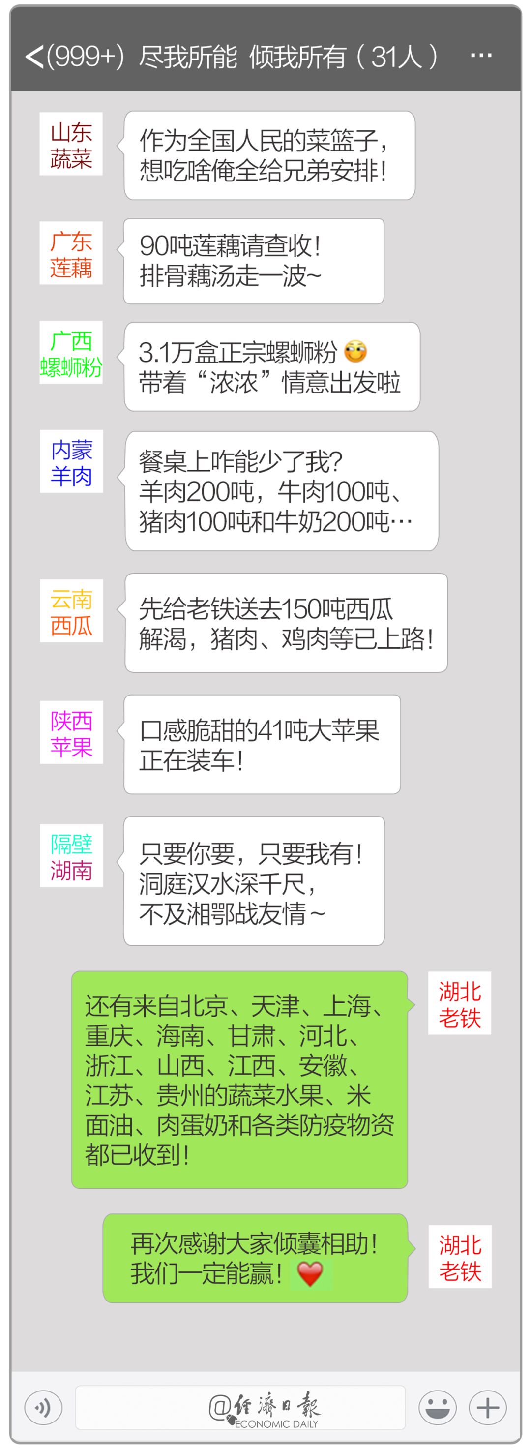 当然,还有来自北京、天津、上海、重庆、海南、甘肃、河北、浙江、山西、江西、安徽、江苏、贵州、宁夏等各个省份的蔬菜水果、米面粮油、肉禽蛋奶和各类防疫物资,源源不断送往湖北,摆上超市货架,装进市民的菜篮子,带着全国人民的牵挂和希望,同湖北一起共渡难关。