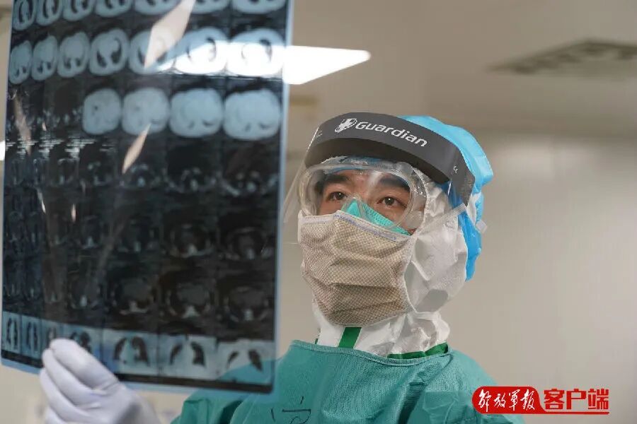 宋立强,军队支援湖北医疗队队员,火神山医院重症医学一科副主任,图为宋立强查看患者胸部CT。(高辉 摄)
