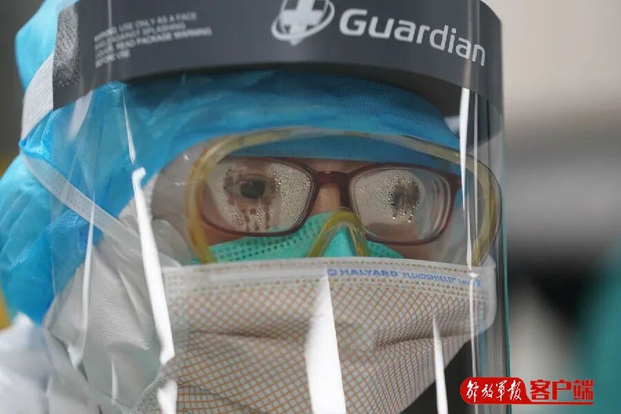 2月12日,火神山医院重症医学一科,胡爽护士的眼镜早已被雾气打湿,透过镜片依然可以看到坚毅沉着的眼神。确认过眼神,他们是患者最信赖的人。(高辉 摄)