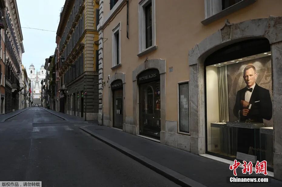 当地时间3月12日,意大利罗马市中心一条购物街上,店铺关闭,空无一人。