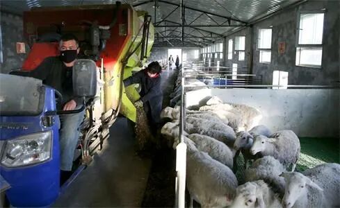 在于田县科克亚乡多胎肉羊扩繁场,工人正在投喂饲草料。许晓龙摄