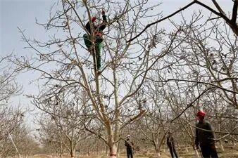 3月4日,墨玉县喀尔赛镇永安村的农村技术员正在对核桃园的果树进行修剪。许晓龙摄
