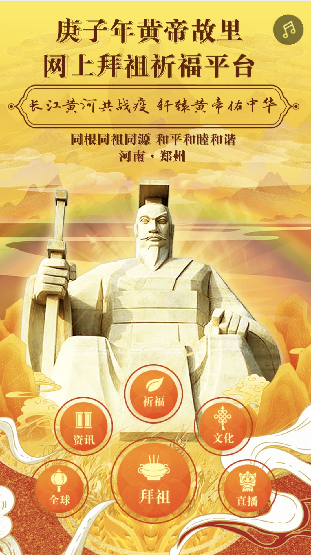庚子年黄帝故里拜祖大典将于3月26日在河南郑州新郑黄帝故里轩辕广场如期举行,大典主题为“同根同祖同源,和平和睦和谐”,今年将突出“长江黄河共战疫,轩辕黄帝佑中华”这一主线,同时将调整拜祖方式,以“现场无嘉宾、无观众、无演员表演”“大典规格不降、影响力不降”为基本遵循,在郑州市新郑黄帝故里景区简约庄严举办。