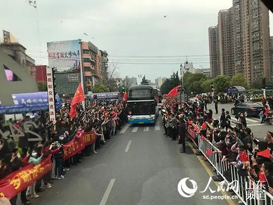 3月17日,在武汉天河机场,山东国家紧急医学救援队队员(左)向江苏国家紧急医学救援队队员挥手致意。新华社记者 熊琦 摄