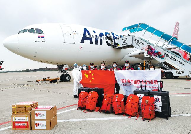 △3月21日,中国赴塞尔维亚抗疫医疗专家组在广州白云国际机场登机前合影。当日,中国赴塞尔维亚抗疫医疗专家组一行6人,从广州搭乘从塞尔维亚派出的专机,并携带部分捐赠医疗物资,前往塞尔维亚协助应对疫情。新华社发