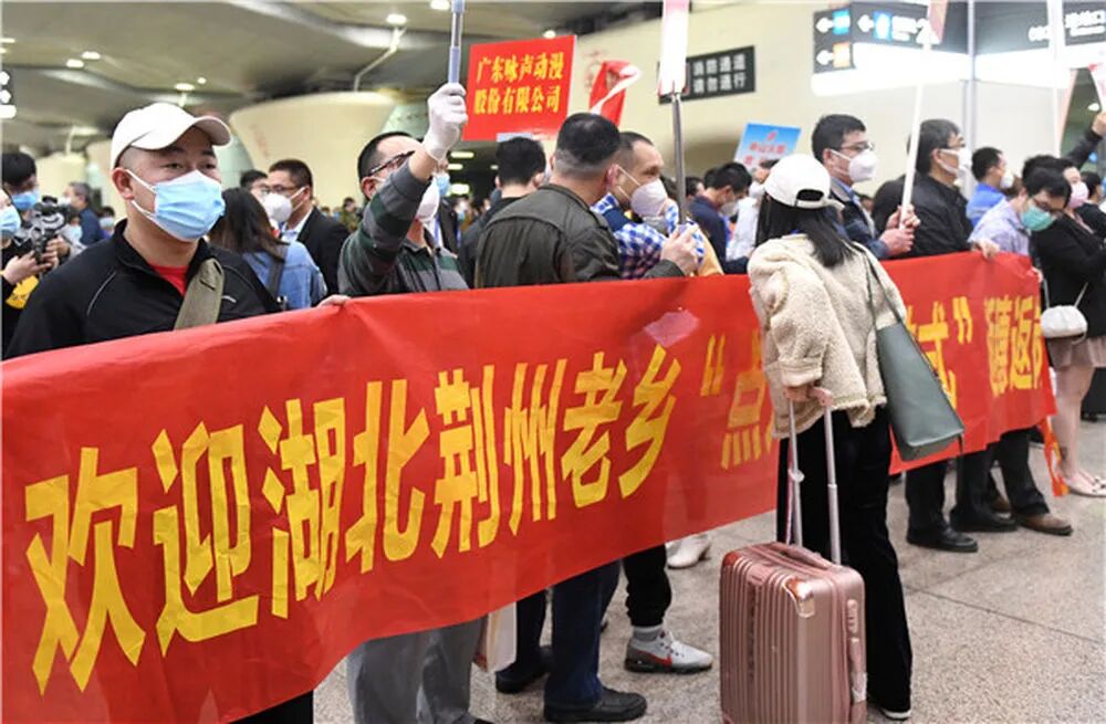 3月19日,接站人员在广州南站迎接湖北返粤务工人员。新华社记者 卢汉欣 摄