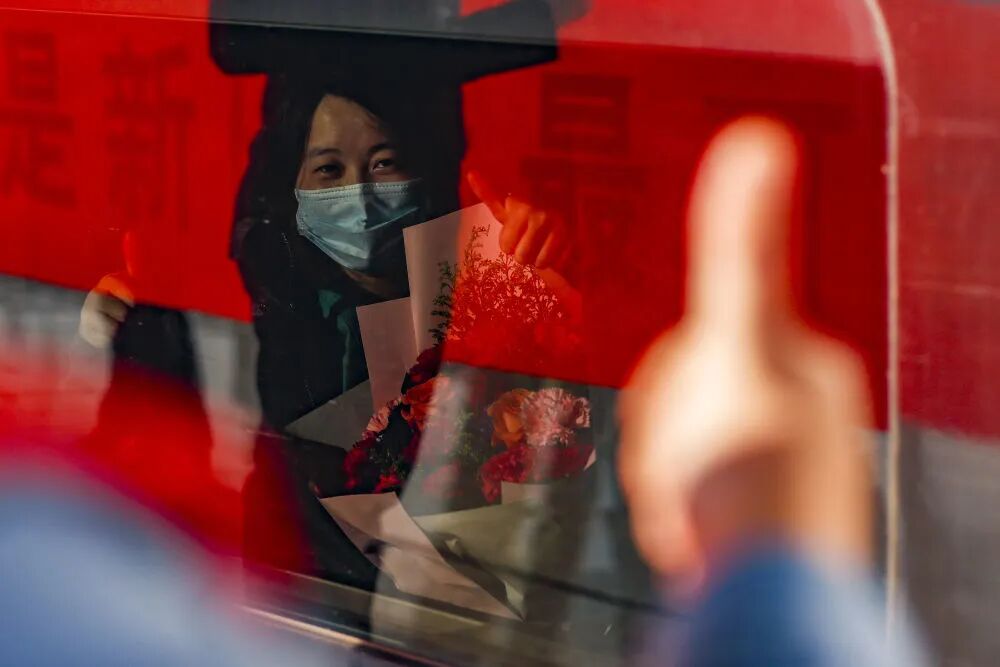 3月17日,在武汉火车站,一名坐上高铁列车即将离开武汉的南华大学附属第一医院医务人员向窗外的欢送人群竖起大拇指,窗外的送行人员也向她竖起大拇指。