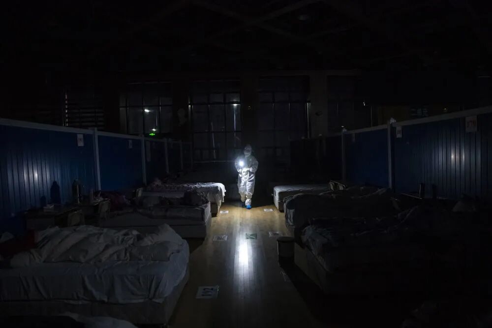 3月9日晚,在武昌方舱医院,江西支援湖北医疗队队员胡佩在熄灯后巡视,查看患者休息情况。