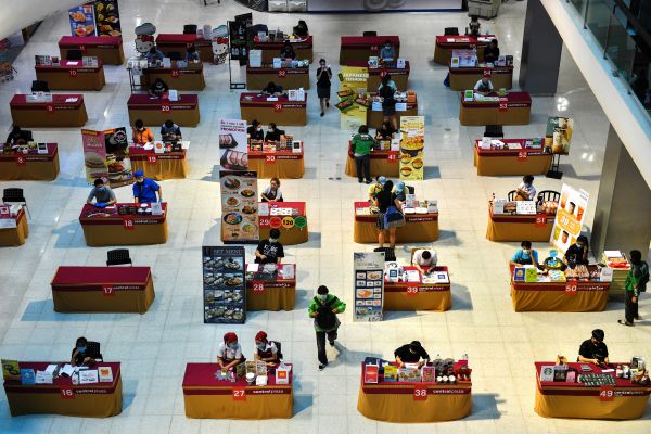 3月24日,在泰国曼谷,一座商场内的多家餐厅设置了保持社交距离的外卖柜台。为防止新冠肺炎疫情扩散,泰国政府规定餐厅只允许做外卖业务。(新华社/路透)