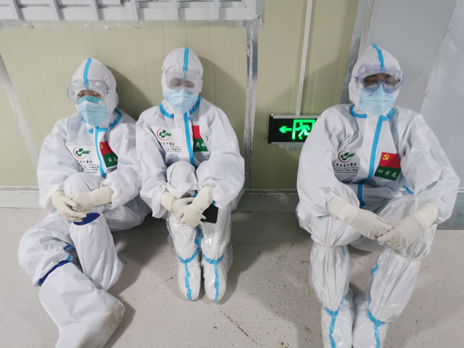 3月28日下午5点,国家援助湖北第四支中医医疗队广东队送完病区最后一位患者。在整理好物品,做好病区终末消毒后,医疗队员累得坐在走廊里睡着了。(来源:人民日报客户端 记者:张意轩 温腾 王军飞)