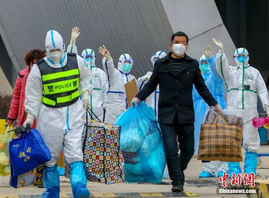 图为武汉客厅方舱医院医务人员送别出院患者。中新社记者 张畅 摄