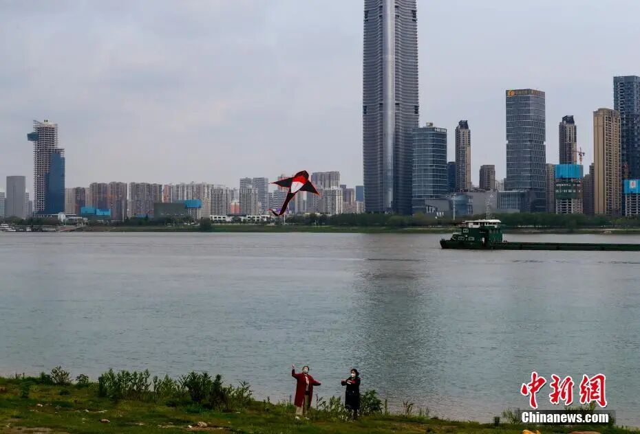 4月1日,市民在汉口江滩放风筝。随着疫情防控形势持续向好,武汉正慢慢恢复昔日的生机与活力。中新社记者 张畅 摄