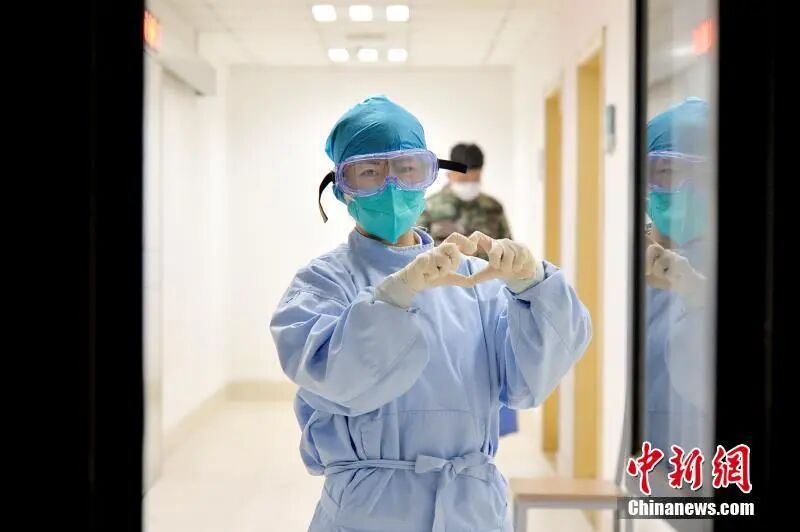 图为医护人员对着镜子整理护目镜。中新社记者 张畅 摄