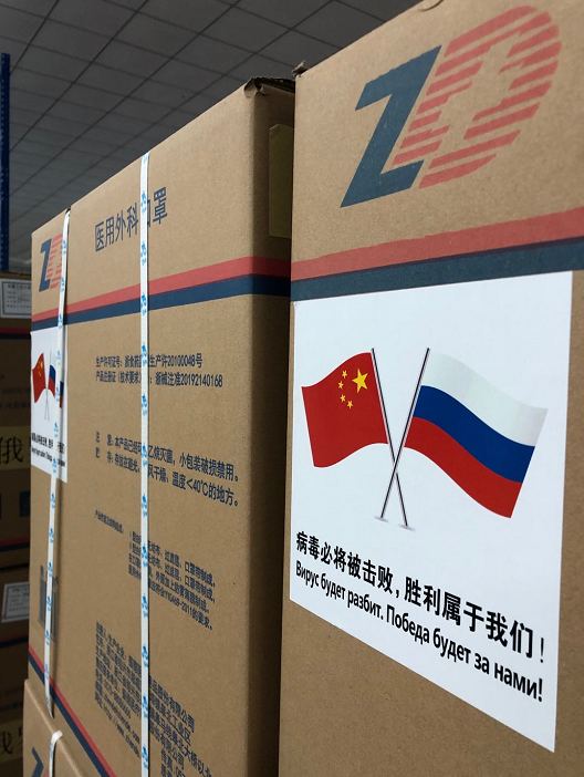 援俄防疫物资,图片为中国驻俄罗斯大使馆提供