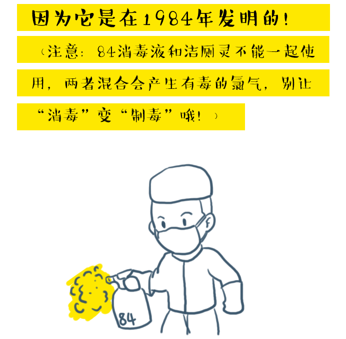 7、 84消毒液为什么要叫84,不是74、94呢? A “84”是“巴氏”的谐音,“巴氏消毒”是国际上一种通用的消毒方式 B 因为它是在1984年发明的!