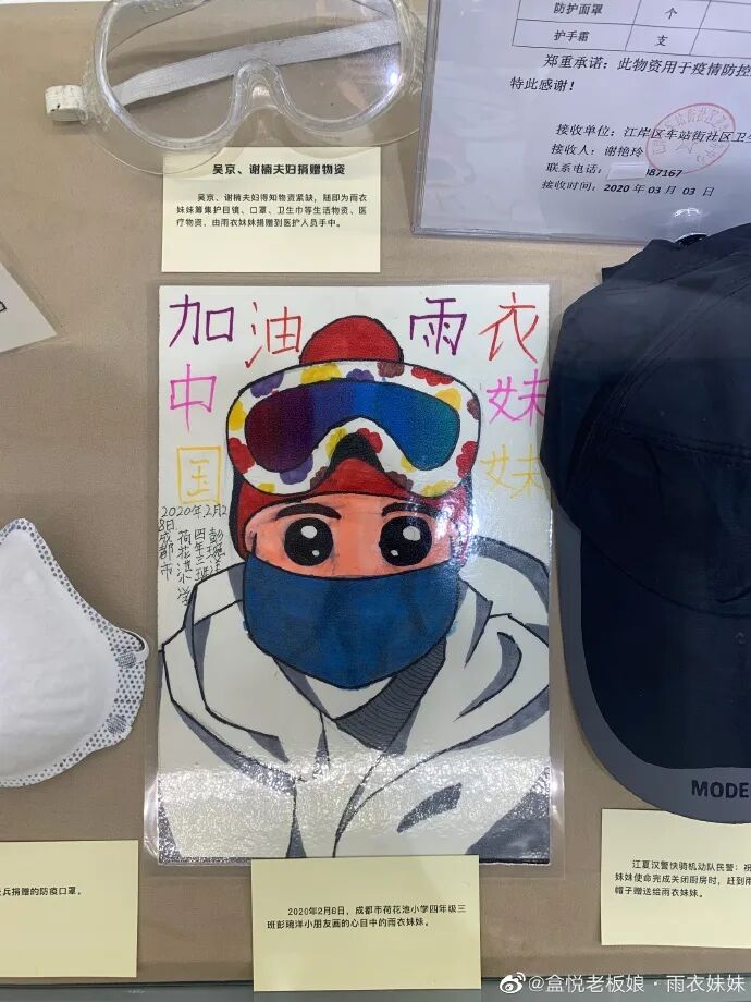 陪伴多日的雨衣、民警赠送的帽子、满是缺口的菜刀、保洁阿姨的橡皮筋、队员自制的补鞋钩针、武汉市民捐赠的“千家衣”……这些看似寻常的物品无声诉说着队员们“逆行”武汉的日与夜,被刘仙放在成都餐厅的玻璃柜中珍藏。餐厅的大门外贴满了便利贴,这些是市民知道“雨衣妹妹”故事后,自发前来为“逆行者”加油打气写下的留言。