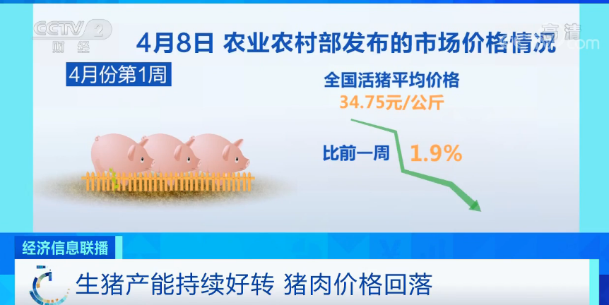 4月8日,农业农村部畜牧兽医局发布了4月份第1周畜产品市场价格情况。数据显示,全国活猪平均价格34.75元/公斤,比前一周下降1.9%。