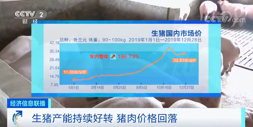 猪肉价格上涨几乎占据了2019年全年的热搜,而且涨幅度大、周期长。以体重90-100千克的外三元生猪品种为例,2019年1月1日国内外三元生猪均价11.30元/公斤,2019年12月27日均价33.53元/公斤,年内整体暴涨196.73%。
