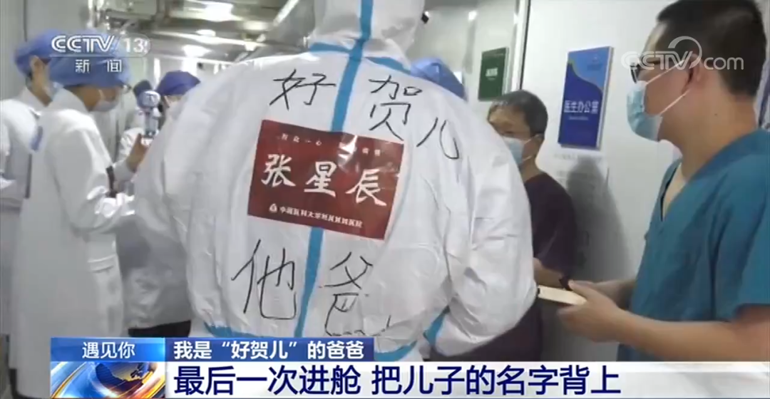 随着患者情况的不断好转,在雷神山的工作也进入到了倒计时阶段。最后一次进舱时,张星辰把儿子的名字写在了自己的防护服上。