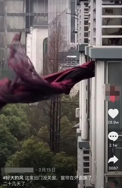 一位武汉网友发了条短视频:邻居家的窗帘在风中乱舞一晃快2个月,窗外的树都绿了窗帘还没有人收…